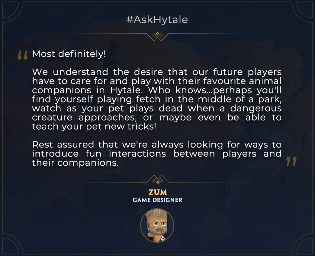 "Most definitely! We understand the desire that our future players have to care for and play with their favourite animal companions in Hytale. Who knows... perhaps you'll find yourself playing fetch in the middle of a park, watch as your pet plays dead when a dangerous creature approaches, or maybe even be able to teach your pet new tricks! Rest assured that we're always looking for ways to introduce fun interactions between players and their companions."